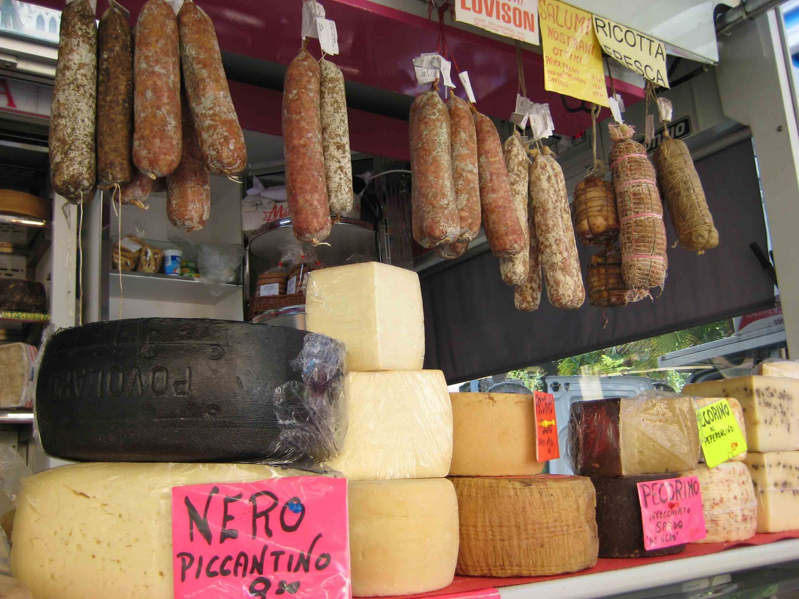 I was able to use a few expressions from my Italian phrase book to purchase some juicy grapes, which later I put in the freezer for a frozen treat. The cheese smelled so amazing, I wanted to run off with a giant wheel of it. Don't worry, I restrained myself. I'm sure they must have weighed a ton. The wheels and bricks of cheese were so large, we could have eaten off them for months--maybe even a year.