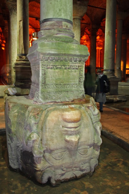 to reach the ceiling, so the builders used recycled stone Medusa heads to make up the